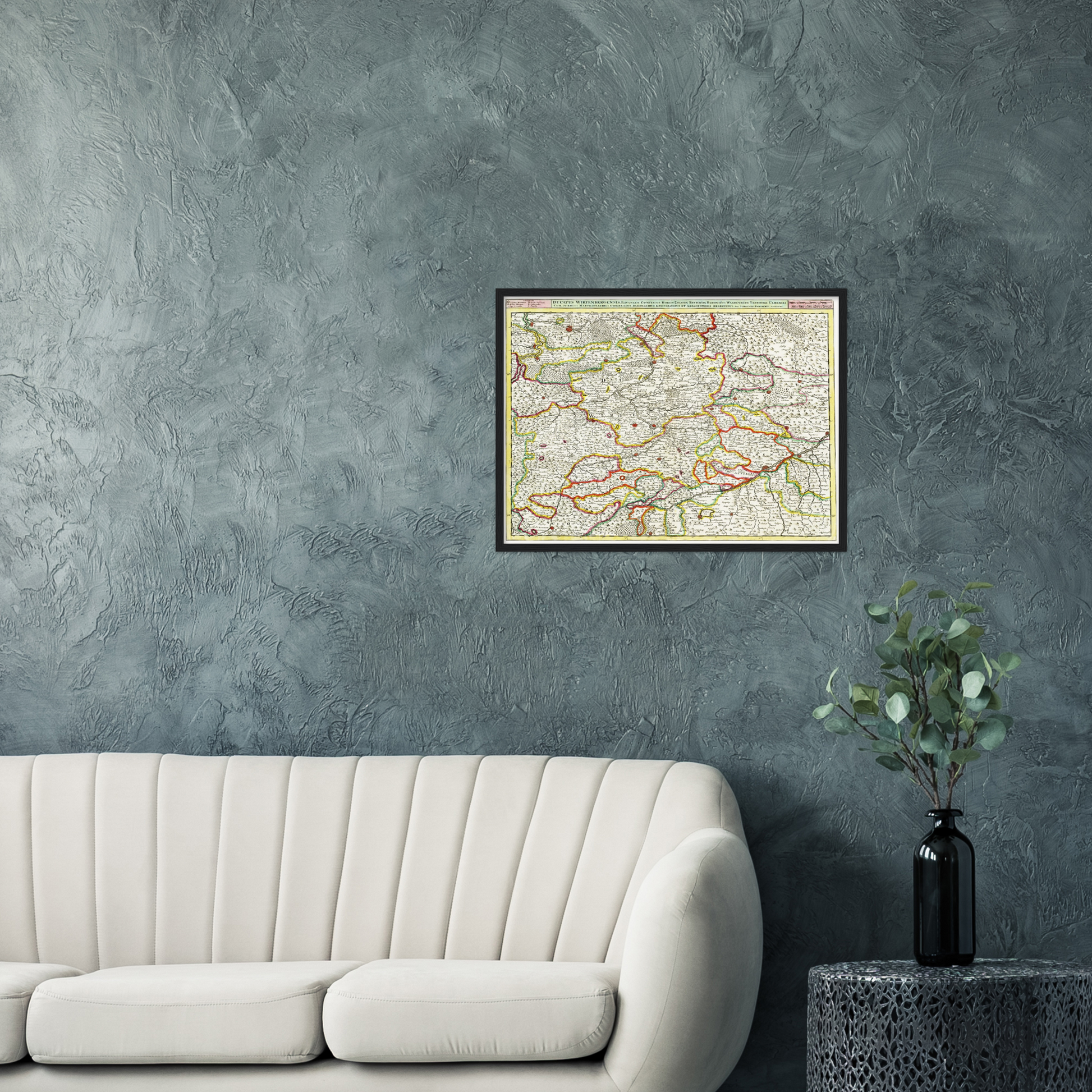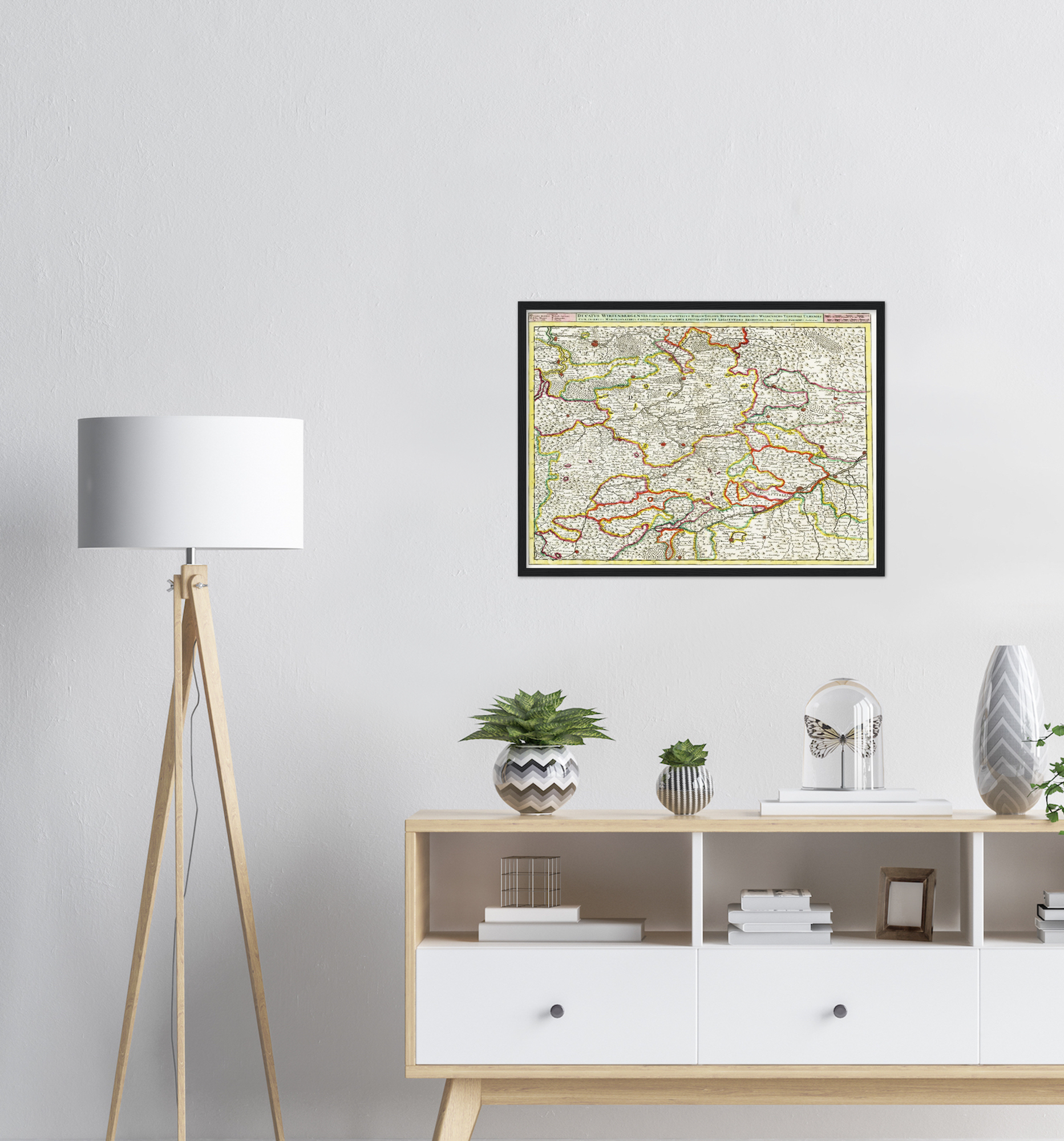Tauchen Sie ein in die Vergangenheit und lassen Sie sich von der kunstvollen Darstellung des alten Württemberg verzaubern. Diese Karte, die in der Blütezeit des Barocks entstanden ist, reflektiert nicht nur geografische Gegebenheiten, sondern auch das damalige Verständnis von Kunst und Wissenschaft. Die feinen Linien und Gravuren lassen die Landschaften lebendig erscheinen, während die kunstvollen Illustrationen die kulturelle Bedeutung der Region unterstreichen. Betreten Sie eine Welt voller Geschichte und erleben Sie, wie die Vergangenheit in Ihren Wohnräumen lebendig wird.