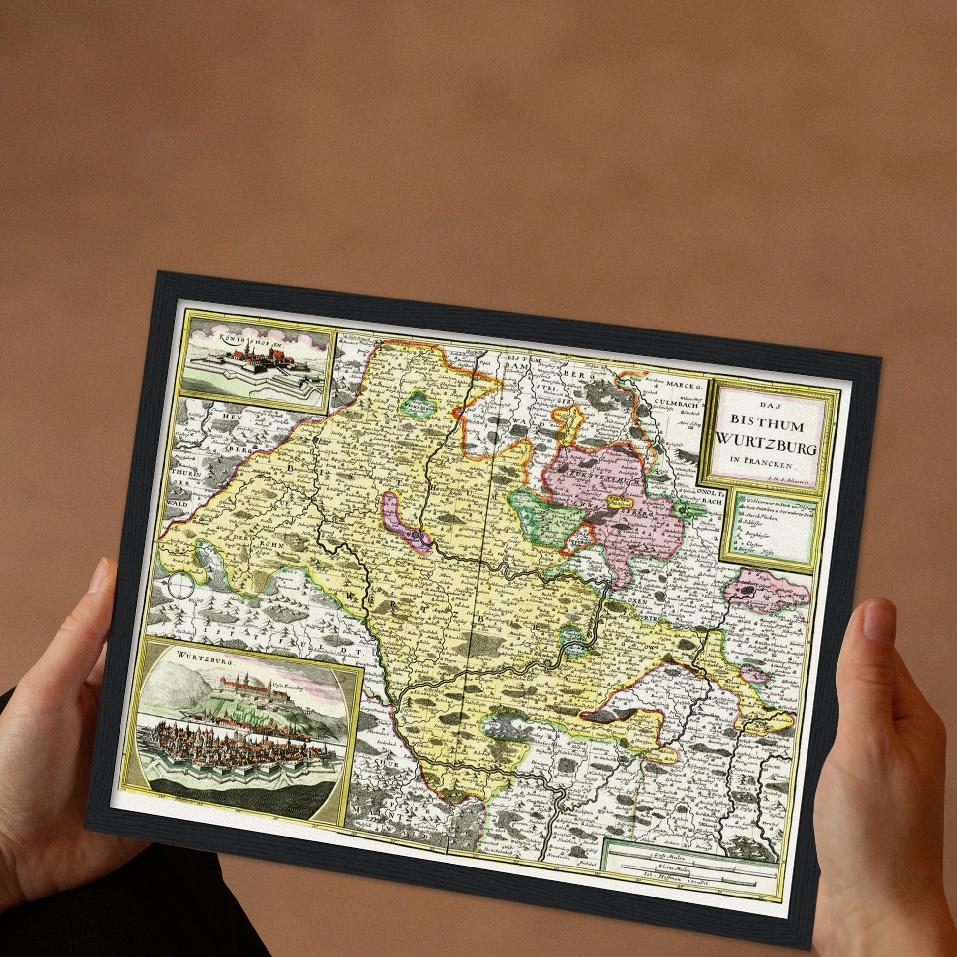 Tauchen Sie ein in die faszinierende Welt des späten 17. Jahrhunderts mit der historischen Landkarte Würzburg um 1676.
