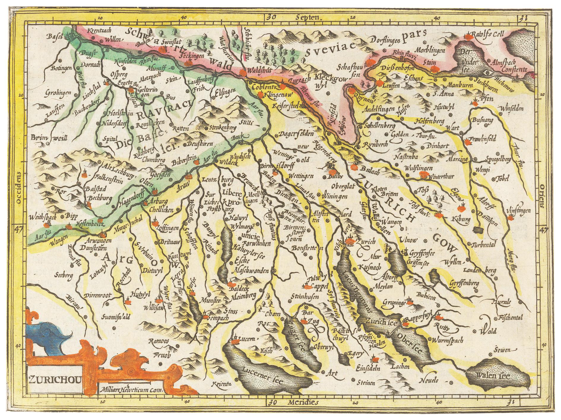 Historische Landkarte Zürichgau um 1609 – Eine faszinierende Reise in ein vergangenes Zeitalter, die auf beeindruckende Weise die historischen Grenzen und Topographie der Region Zürich verewigt.