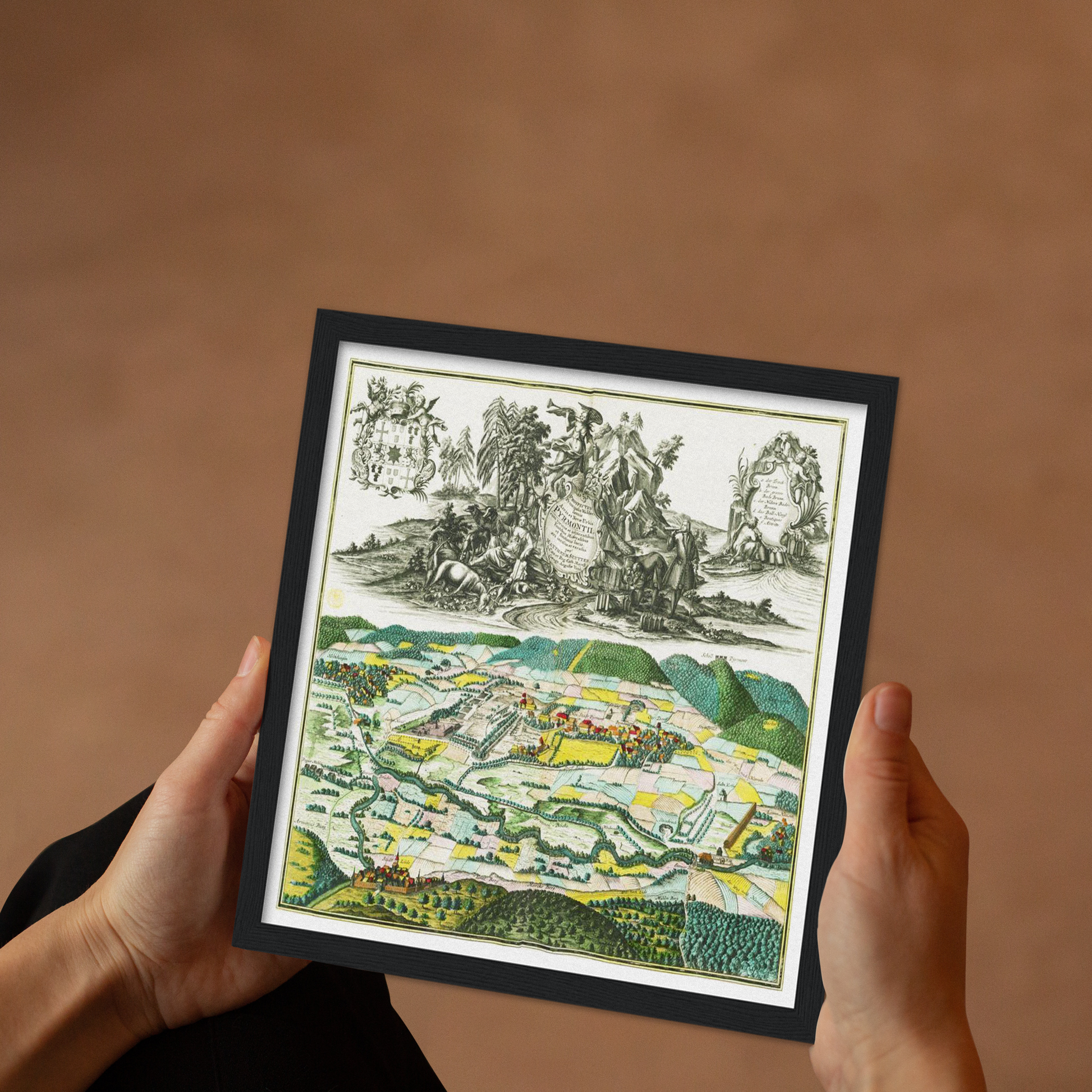 Unsere Nachdrucke entstehen in Archivqualität auf feinstem, mattem Papier (250 g/m²), das jedem Raum eine eindrucksvolle Note verleiht. Die hochauflösende Digitalisierung und farbgetreue Rekonstruktion garantieren, dass du ein Stück Geschichte in unvergleichlicher Schärfe und Brillanz erlebst. Jeder Druck wird auf Bestellung in Deutschland gefertigt und ist in 3 erlesenen Größen erhältlich: 30x30 cm. Zum Schutz wird jede Karte in einer stabilen Verpackung versandt. Optional kannst du zwischen natürlichen, dunkelbraunen oder schwarzen Holzrahmen sowie einem eleganten schwarzen Metallrahmen wählen, der mit bruchsicherem Plexiglas ausgestattet ist.