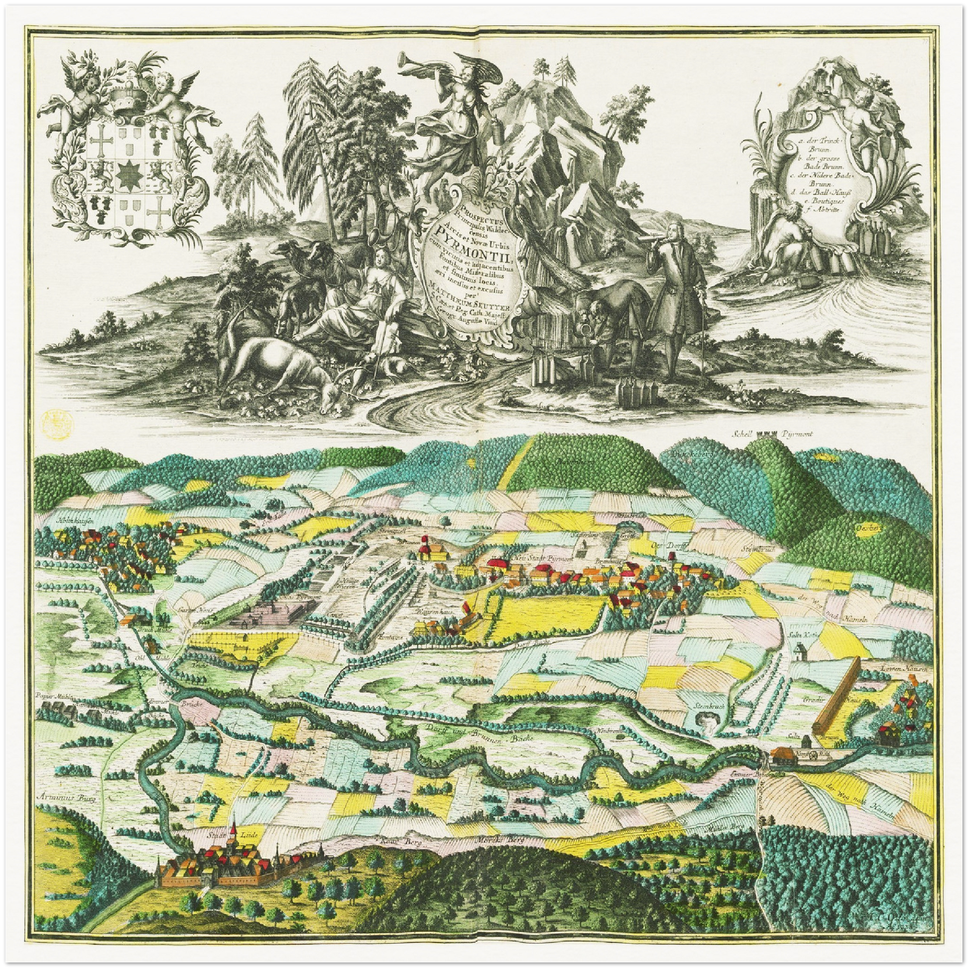Tauchen Sie ein in die faszinierende Historie einer der ältesten Städte Deutschlands mit dieser detailgetreuen Nachbildung der historischen Stadtansicht von Bad Pyrmont um 1750.