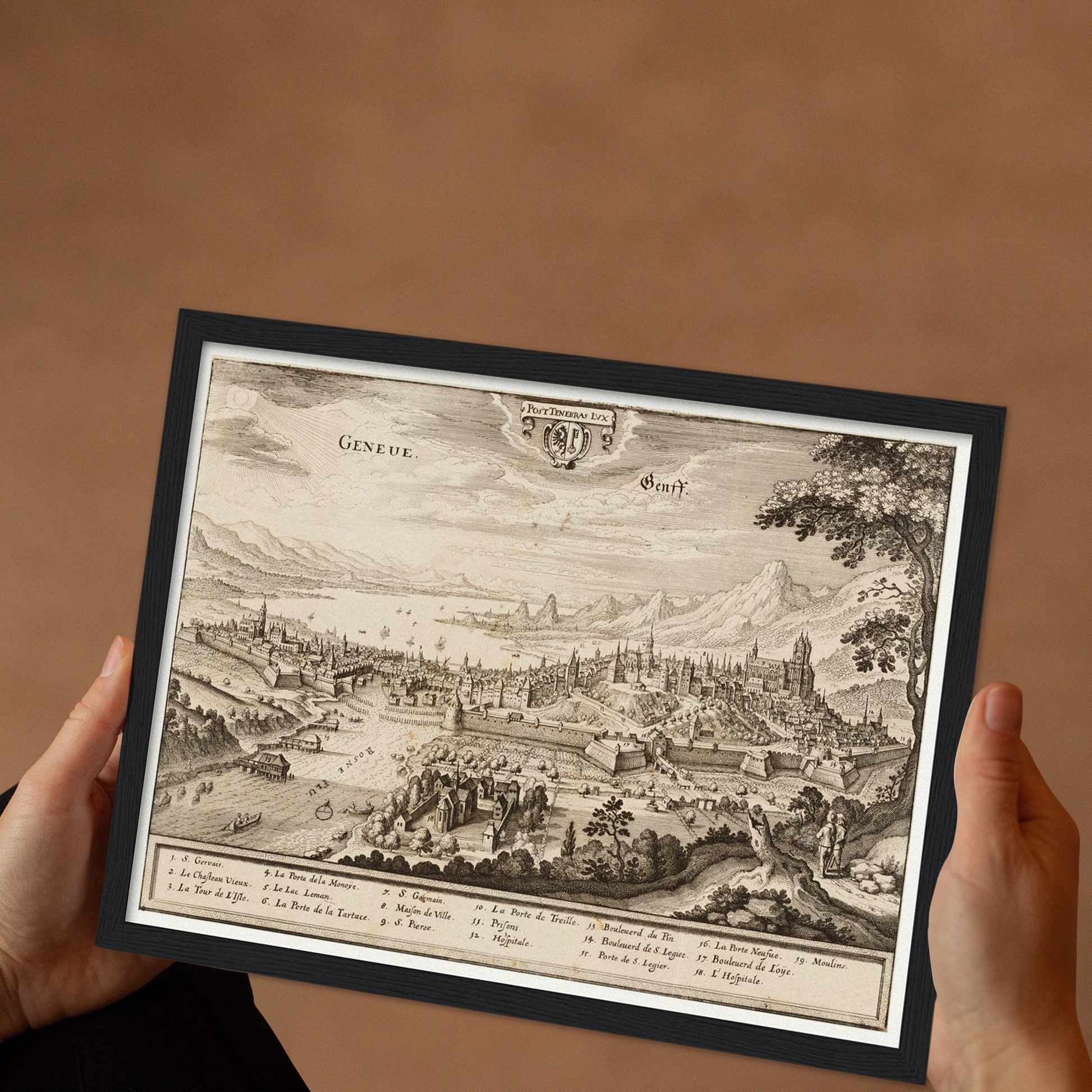 Tauchen Sie ein in das goldene Zeitalter der Renaissance mit dieser detailverliebten Stadtansicht von Genf um 1650, die Geschichte und Kunst in einem atemberaubenden Kunstwerk vereint.