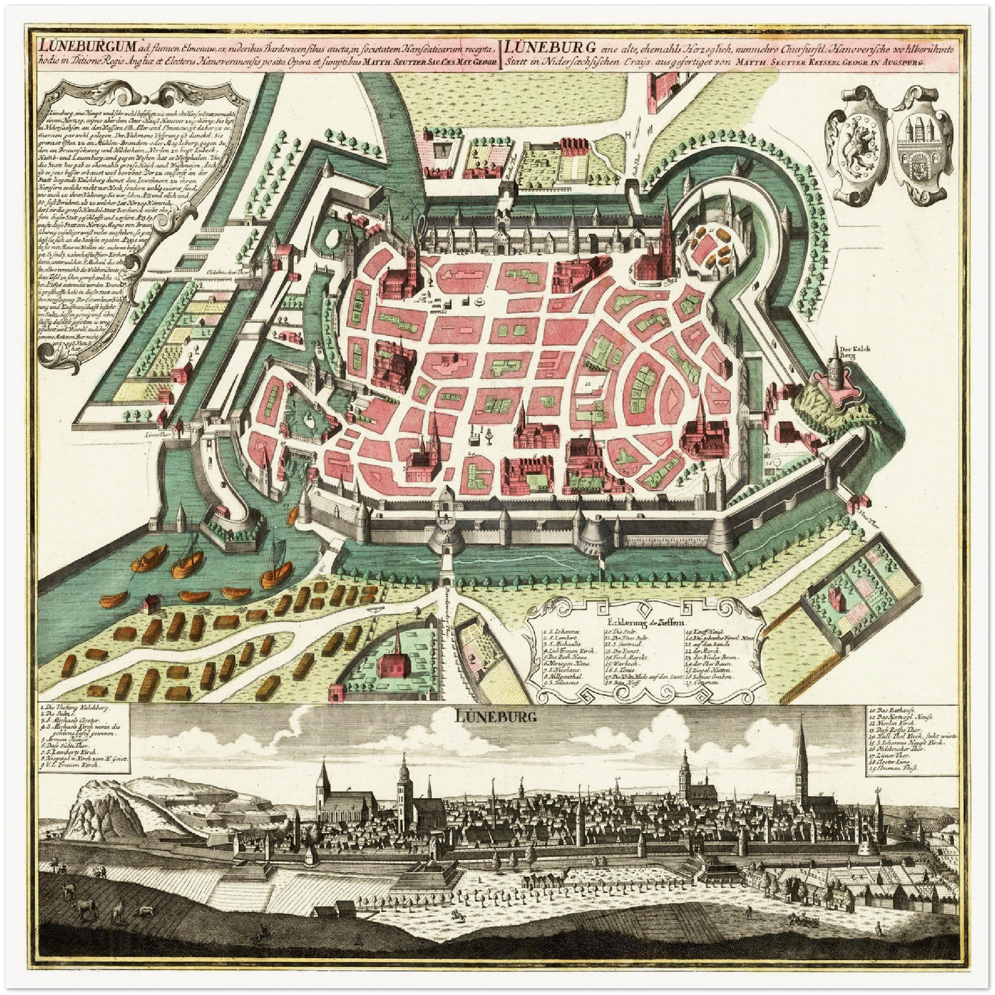 In der Betrachtung dieser historischen Stadtansicht von Lüneburg, die um das Jahr 1740 entstanden ist, eröffnet sich dem Betrachter eine faszinierende Fenster in die Vergangenheit. Die feine Linienführung und die sorgfältig eingeprägten Details erzählen von einer Stadt, die im Glanz der frühen Neuzeit erstrahlt. Einst ein Zentrum des Salzhandels und voller Geschichte und Bedeutung, fängt diese Karte die Essenz einer längst vergangenen Zeit ein. Die filigrane Gravur und der einzigartige Stil ziehen den Betrachter in ihren Bann und verleihen dem Kunstwerk seinen unverwechselbaren Charakter. Dieser Nachdruck, auf hochwertigem mattem Papier präsentiert, wird Dein Zuhause nicht nur um ein Stück Geschichte bereichern, sondern auch um ein Ausdruck faszinierender Vergangenheit und künstlerischer Finesse.