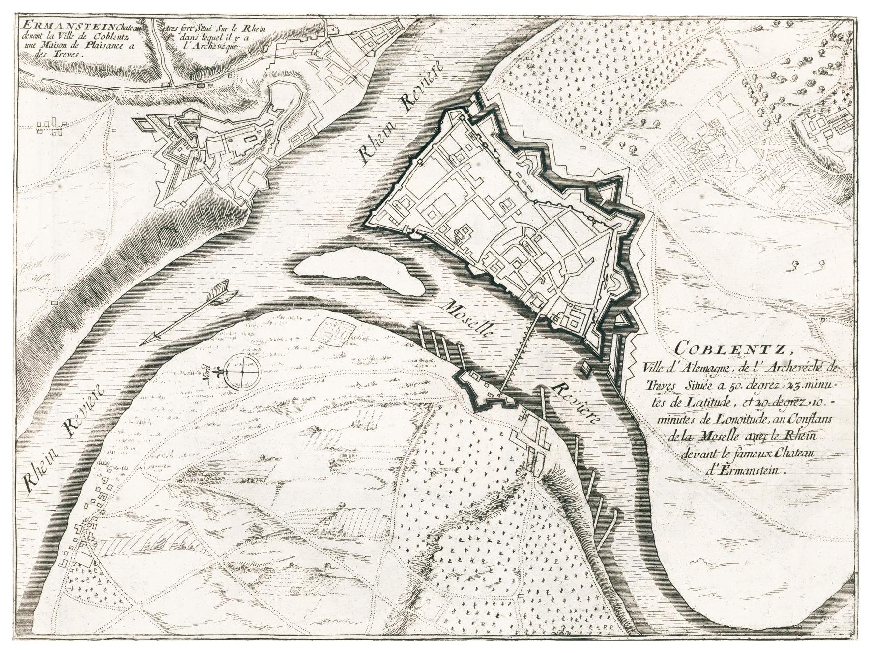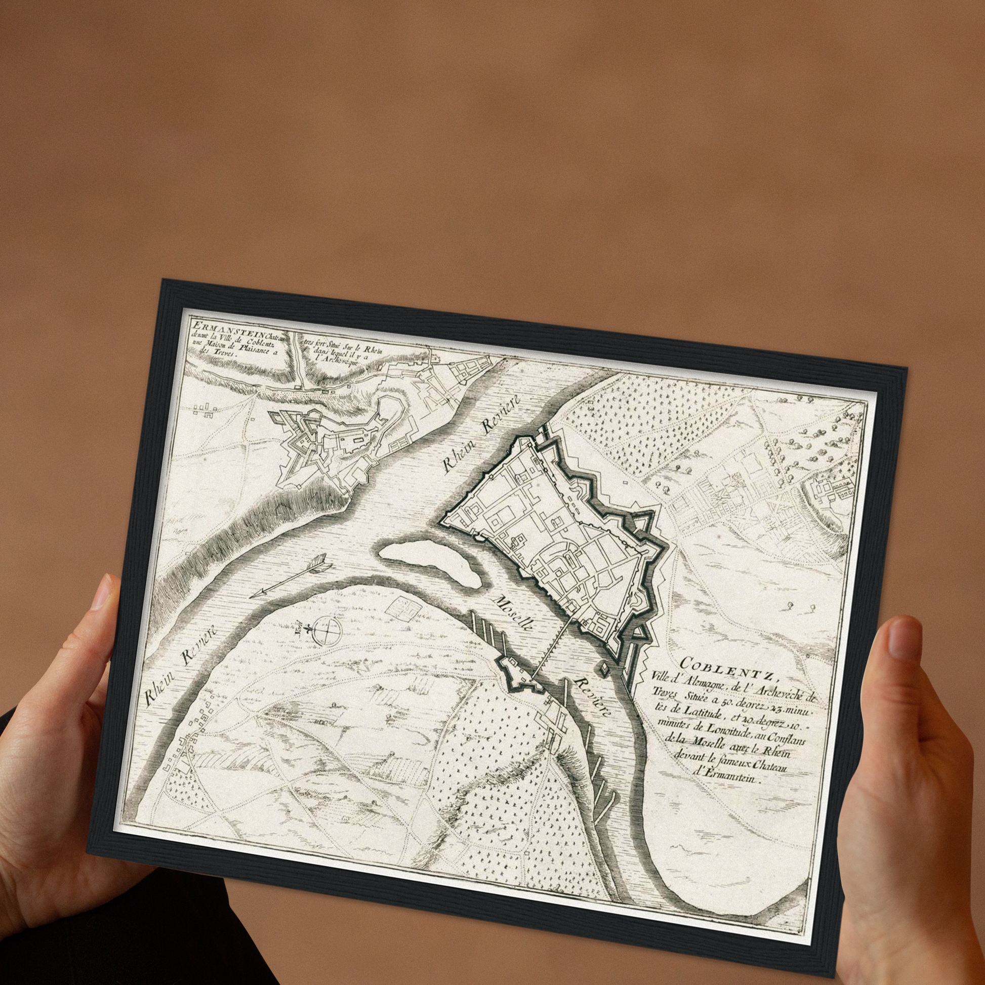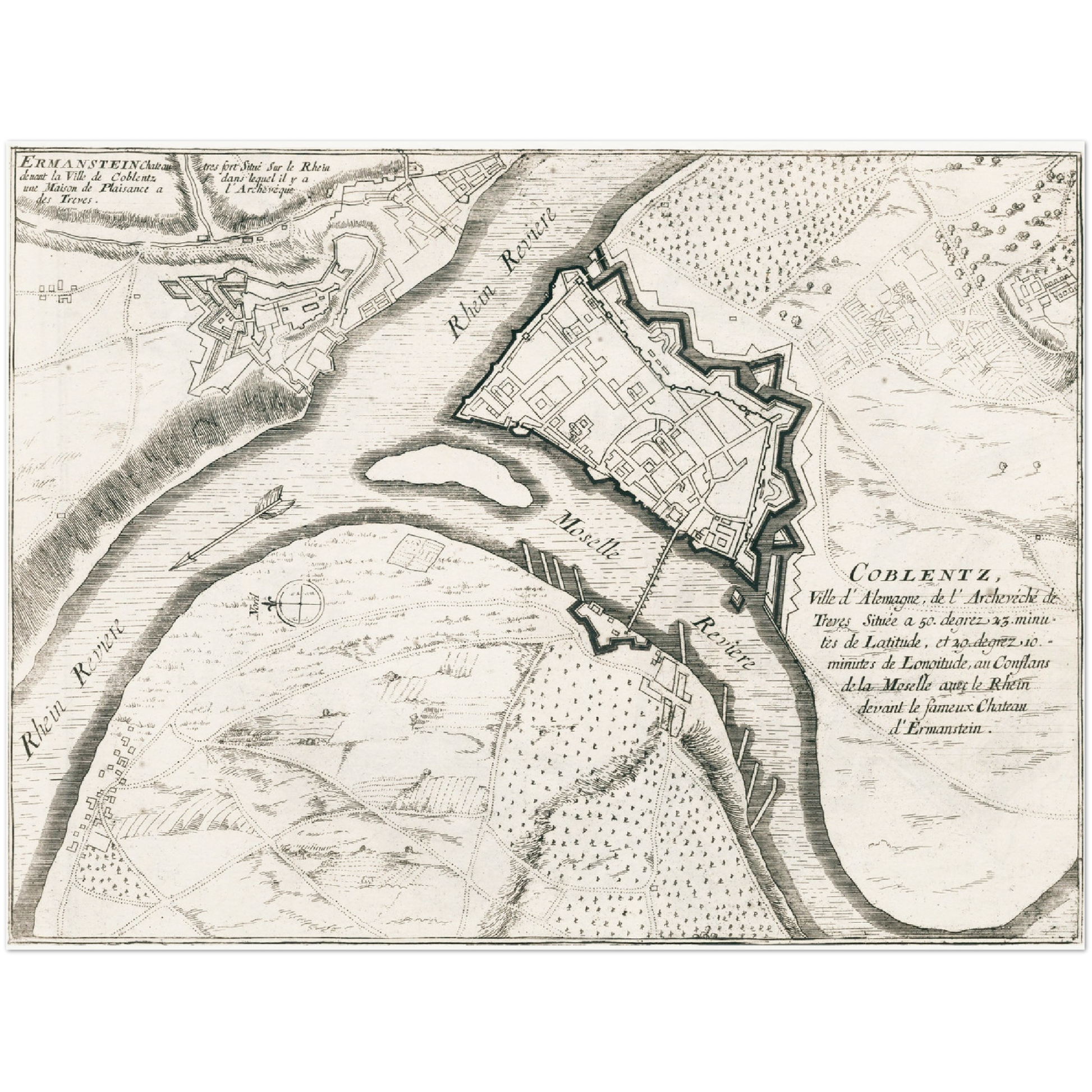 Entdecke den Charme von Koblenz im Jahr 1696 mit diesem prachtvollen historischen Stadtplan.