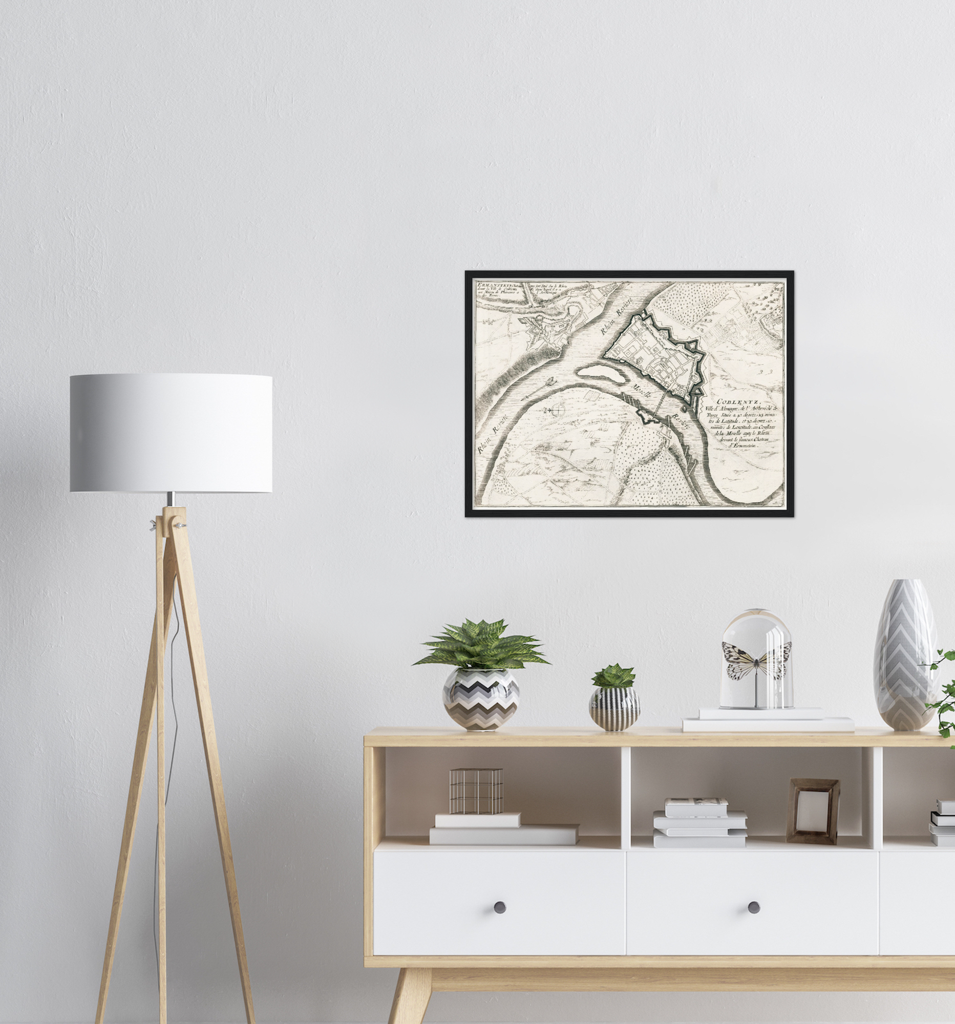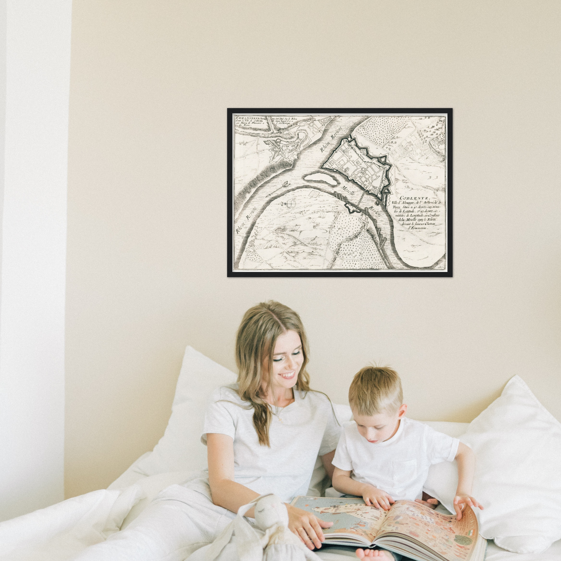 Tauchen Sie ein in die bewegte Geschichte von Koblenz im ausgehenden 17. Jahrhundert. Ein Zeitalter, in dem die Stadt von strategischer Bedeutung war, eingefasst zwischen den romantischen Flüssen Rhein und Mosel. Dieser Nachdruck des historischen Stadtplans von 1696 eröffnet Ihnen eine faszinierende Sicht auf die Straßen und Plätze, die einst von kauzigen Händlern und tapferen Bürgern bewegt wurden. Die feinen Linien und die detailgetreue Gravur laden ein, jedes Detail zu erkunden, und lassen uns an einer Zeitreise teilnehmen, bei der die Kunst der Kartographie nicht nur präzise, sondern auch von künstlerischem Ausdruck geprägt war. Der Druck vermittelt die Atmosphäre einer Zeit, die von Veränderung und Wachstum geprägt war, und bringt ein echtes Stück Geschichte in Ihre vier Wände.